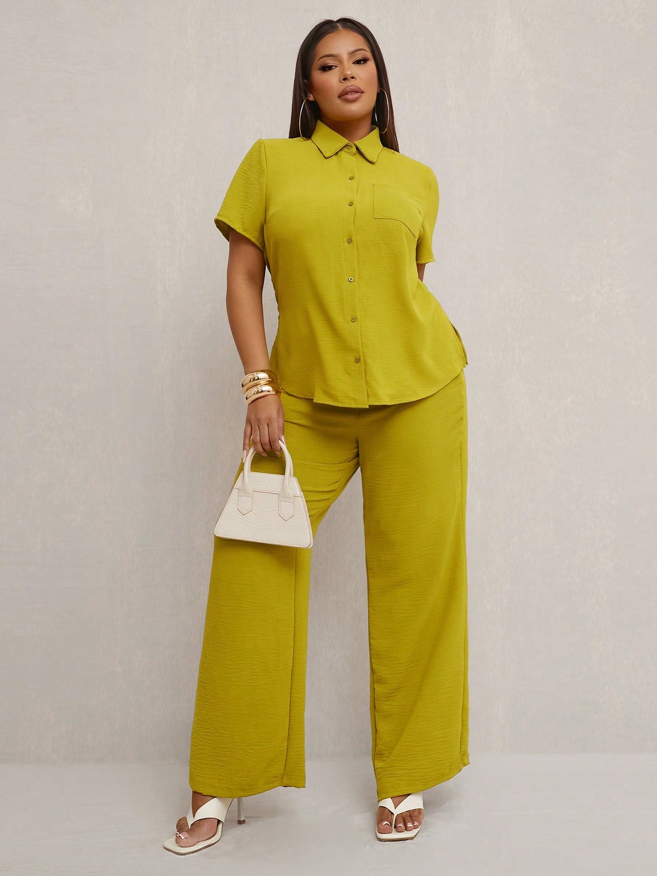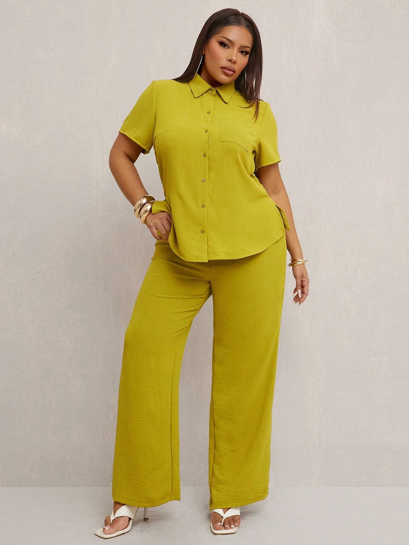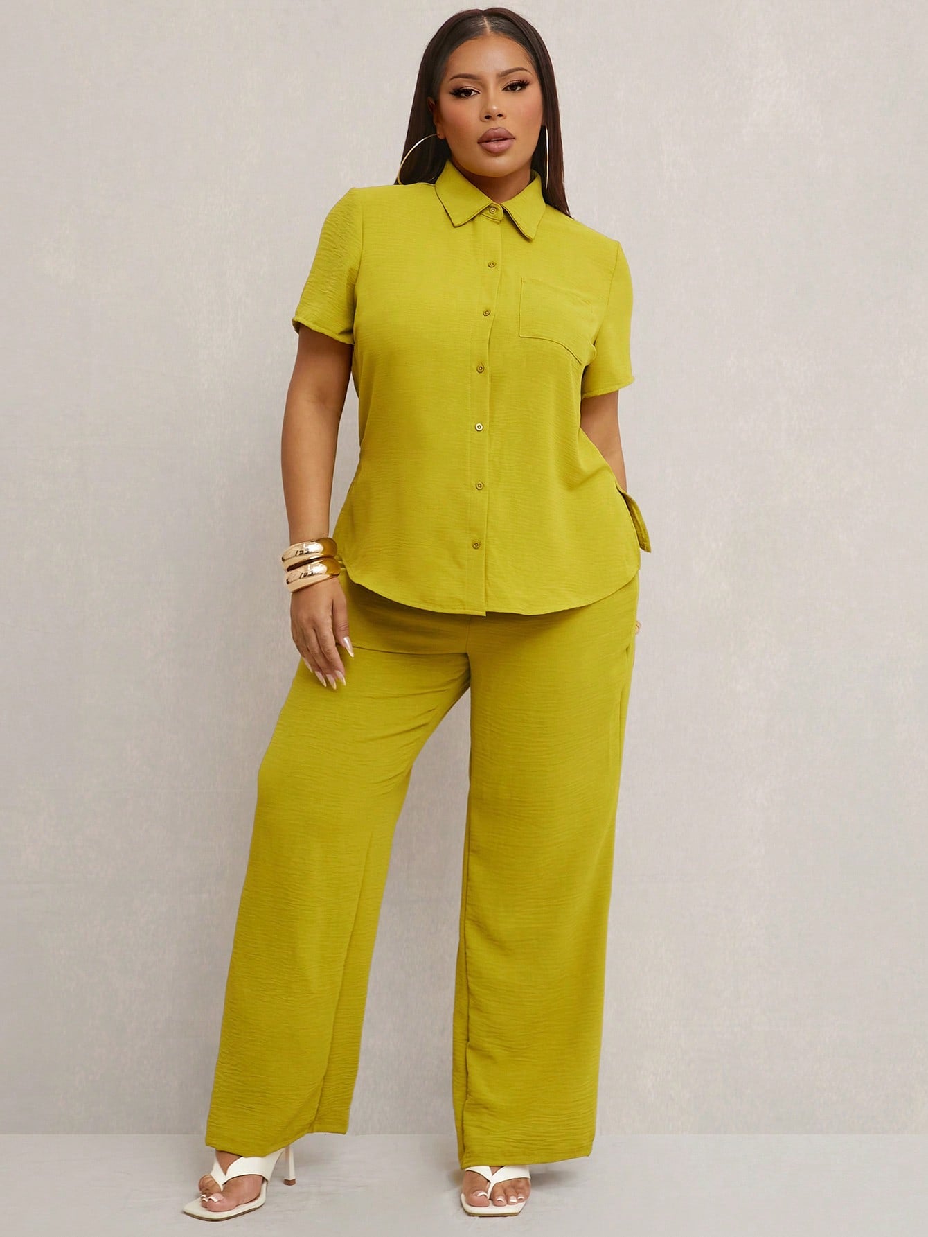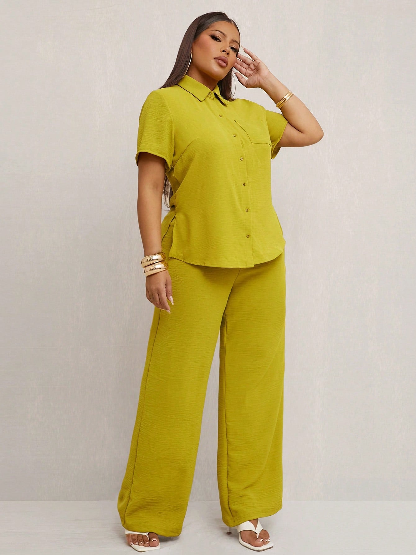 SXY Plus Size Women's Spring&Summer Elegant Sexy 2pcs-SET Casual Short-Sleeved Shirt And Straight Suit Pants, Women's Two Pieces Suits, Suitable For Daily Commuting Office Work Clothes Business,Cruise Attire,Outing,Beach Vacation,Chic,Streetwear,Le