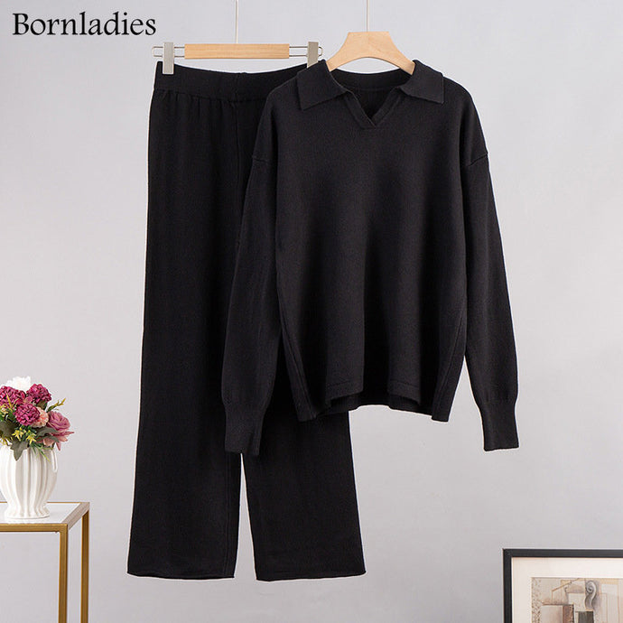 Bornladies – costume tricoté épais pour femme, ensemble 2 pièces en cachemire doux, pull à col Polo et pantalon à jambes larges, tenue tricotée, hiver