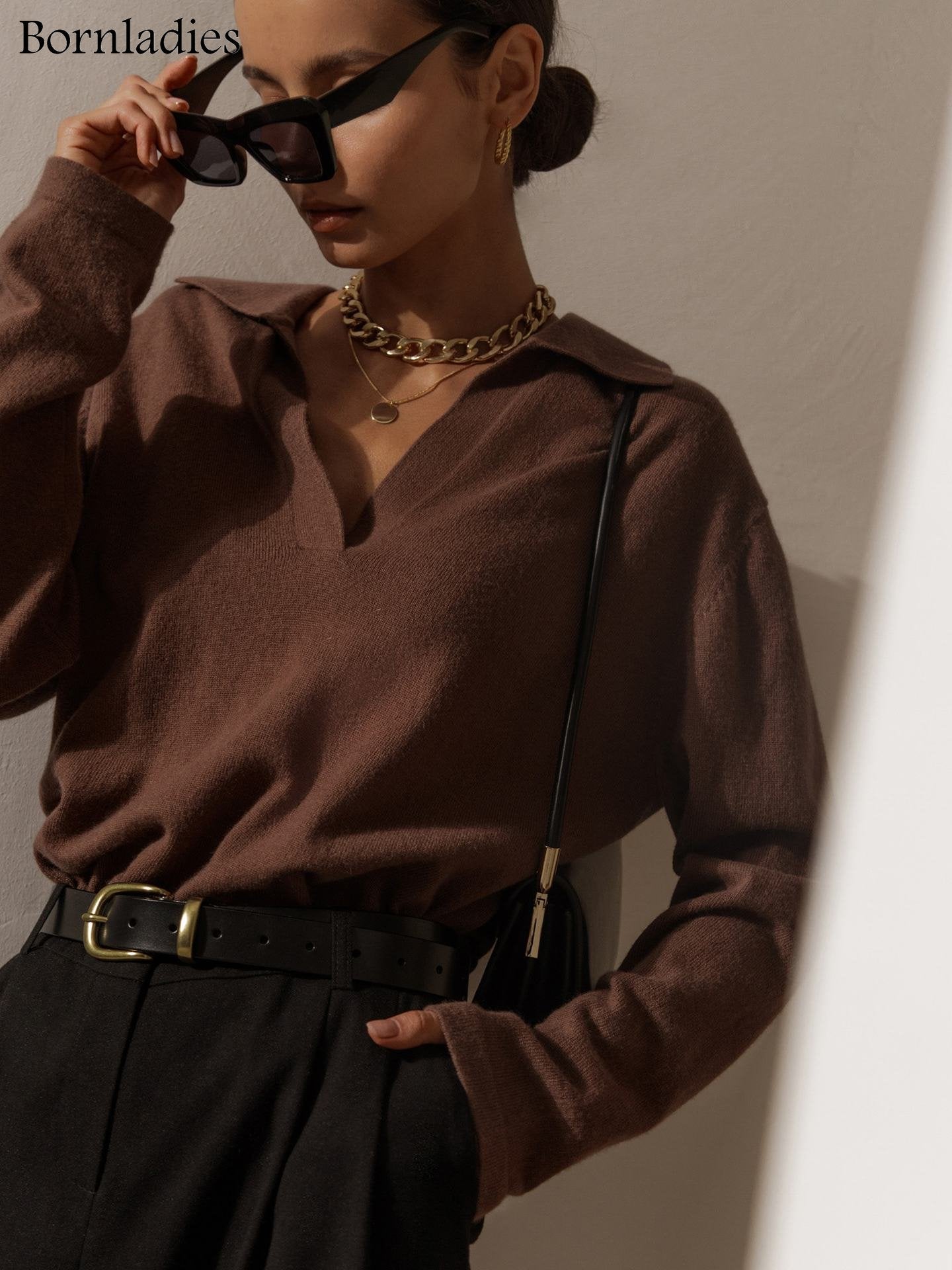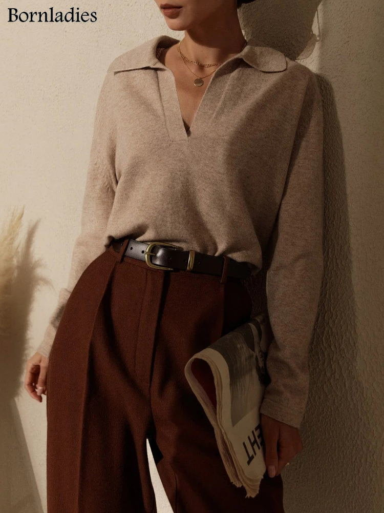 Bornladies – costume tricoté épais pour femme, ensemble 2 pièces en cachemire doux, pull à col Polo et pantalon à jambes larges, tenue tricotée, hiver