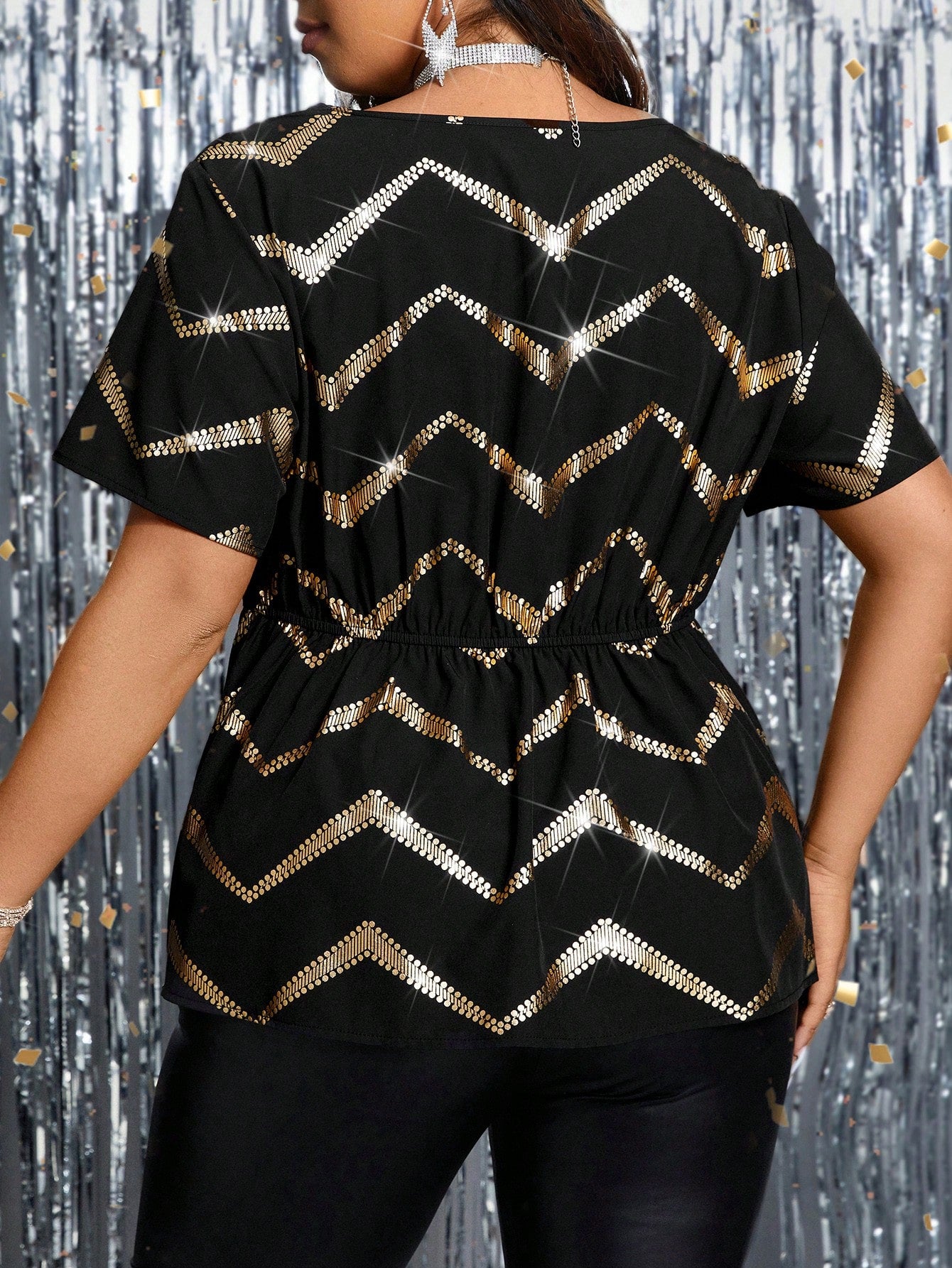 Celure Plus Size Women Asymmetrical Flower Pattern Gold Stamping Round Neck Twist Front Blouse, Summer
