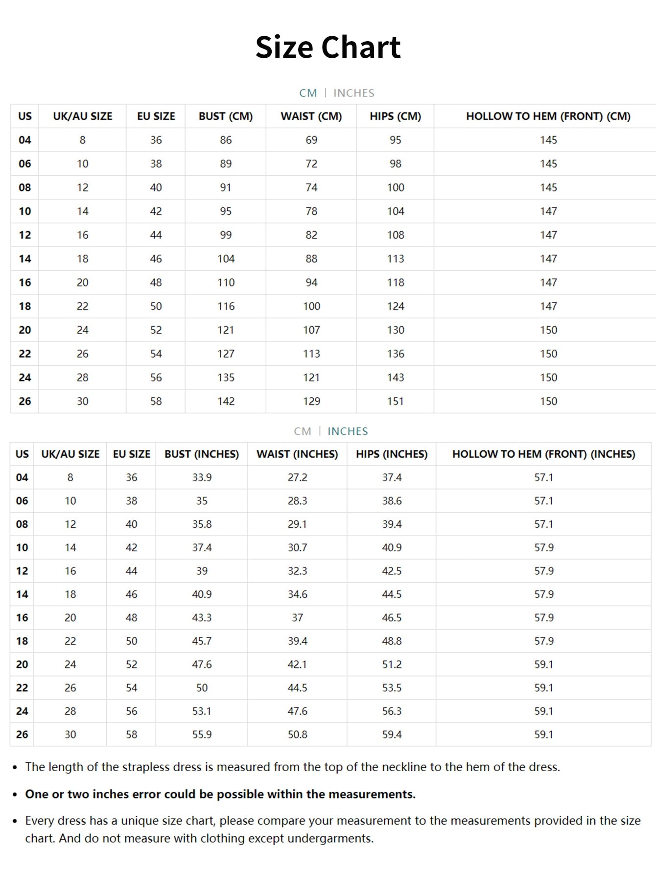 • Chaque robe a un tableau des tailles unique, veuillez comparer vos mesures aux mesures fournies dans le tableau des tailles. Et ne mesurez pas avec des vêtements, sauf avec des sous-vêtements.