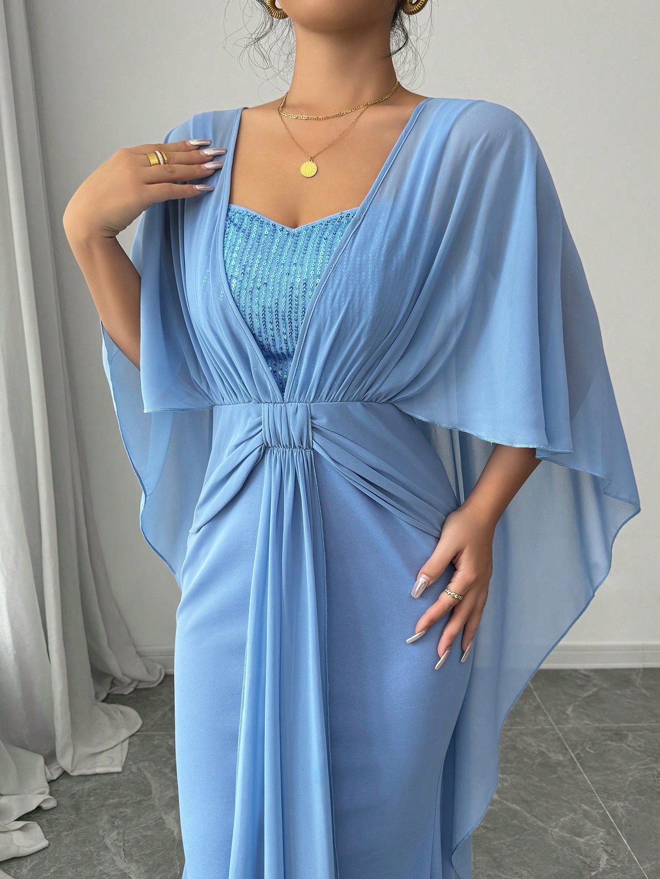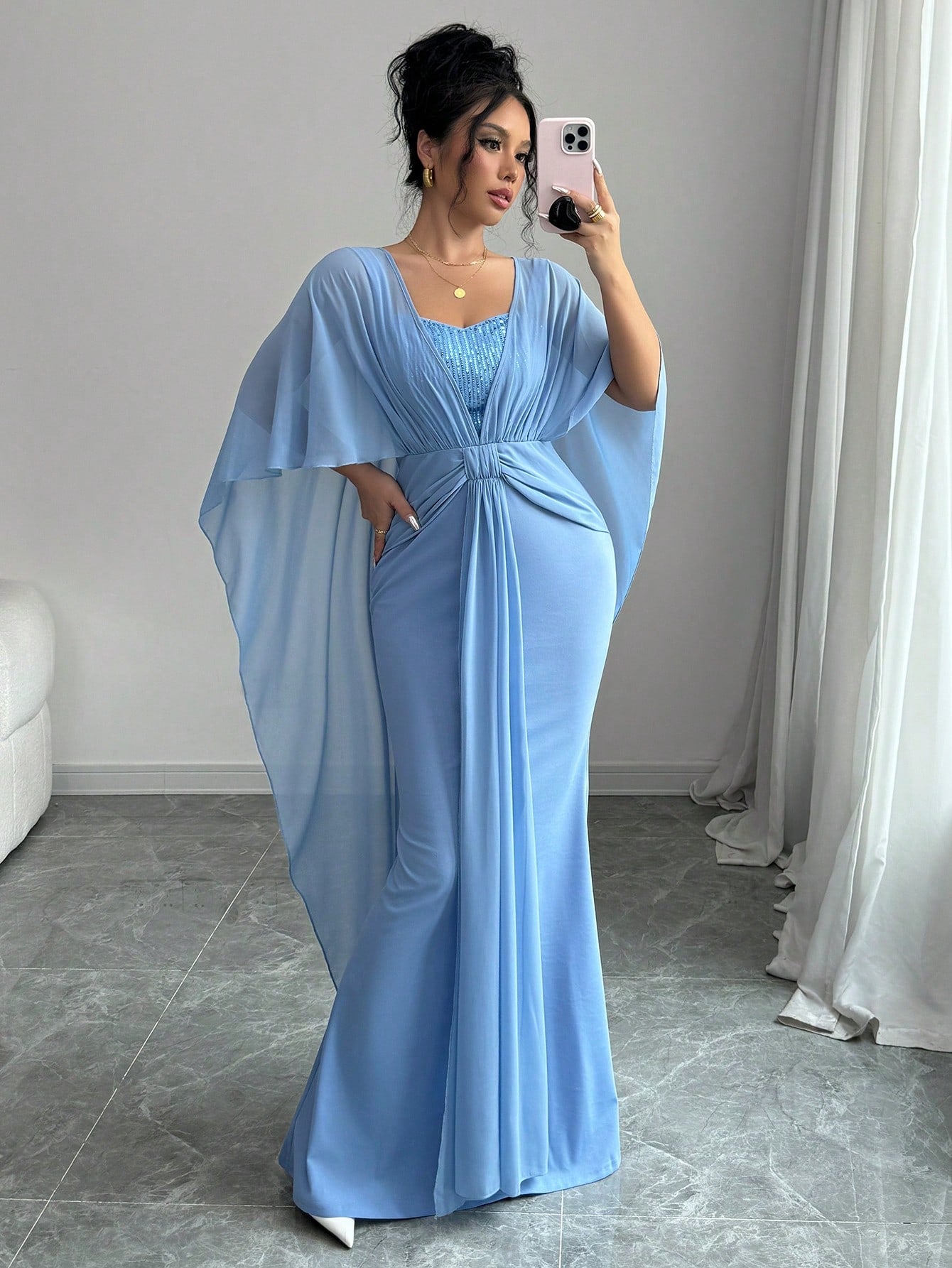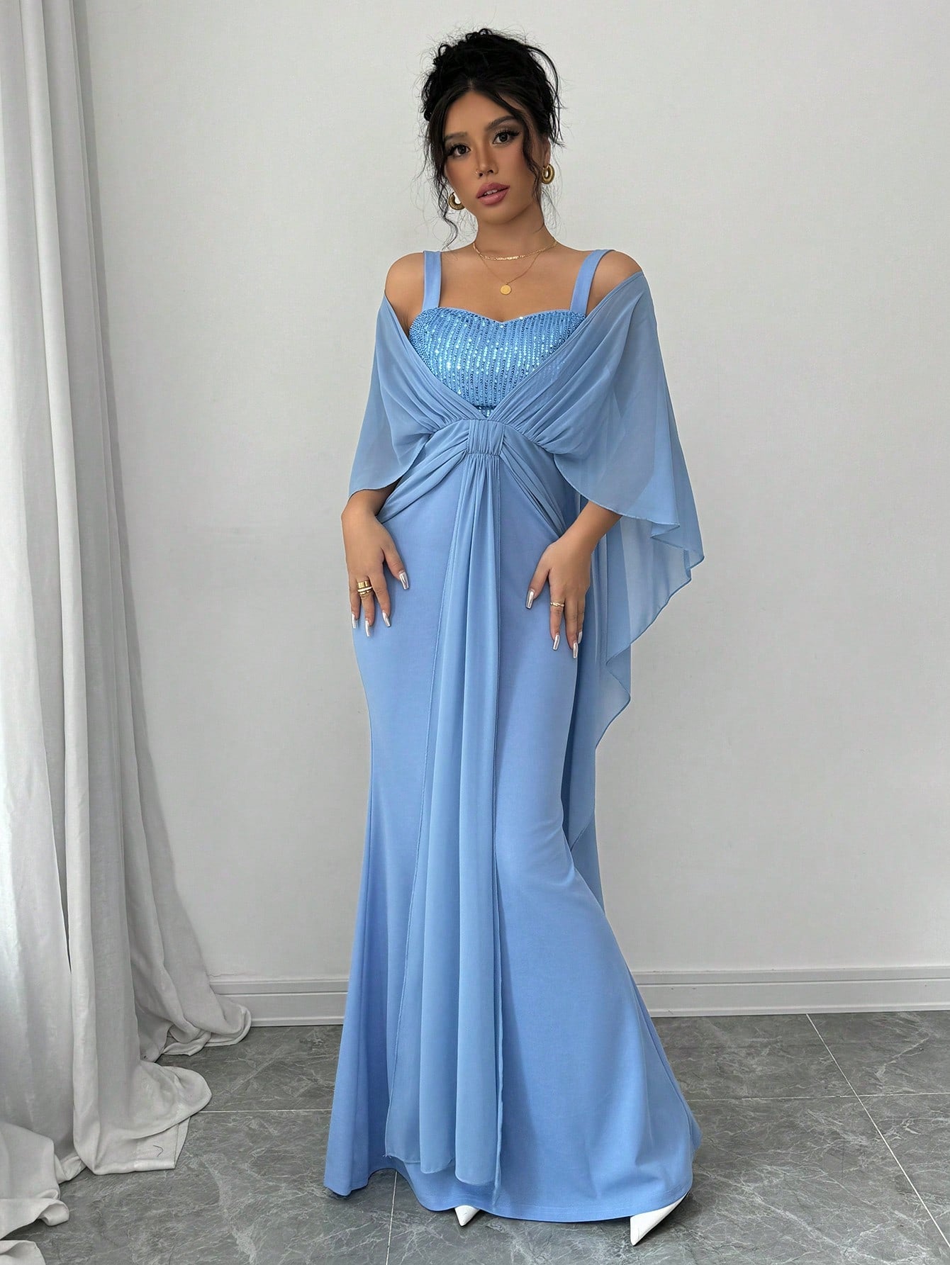 Elenzga Sequin Shawl Glitter Mermaid Hem Elegant Romantic Women Dress Maxi Women Outfit
