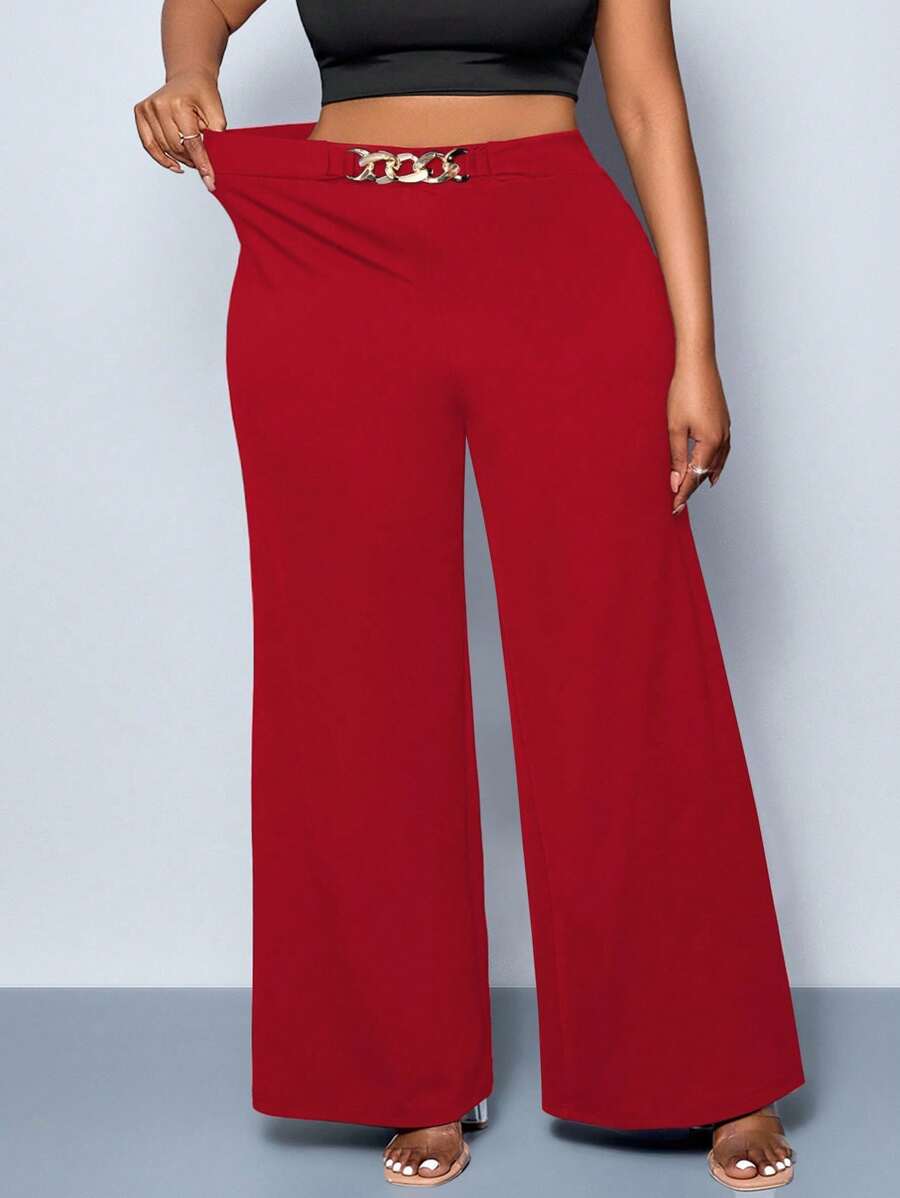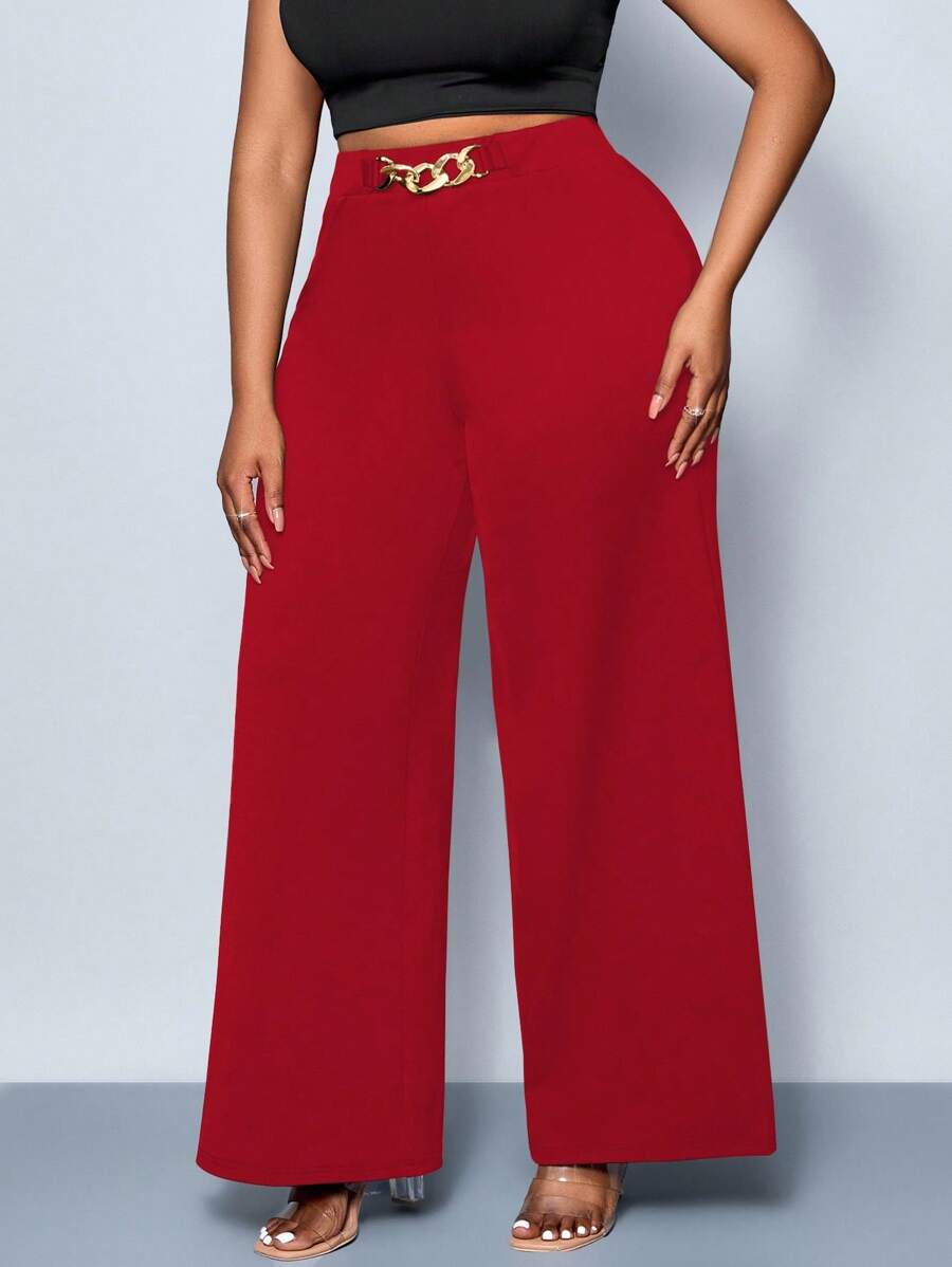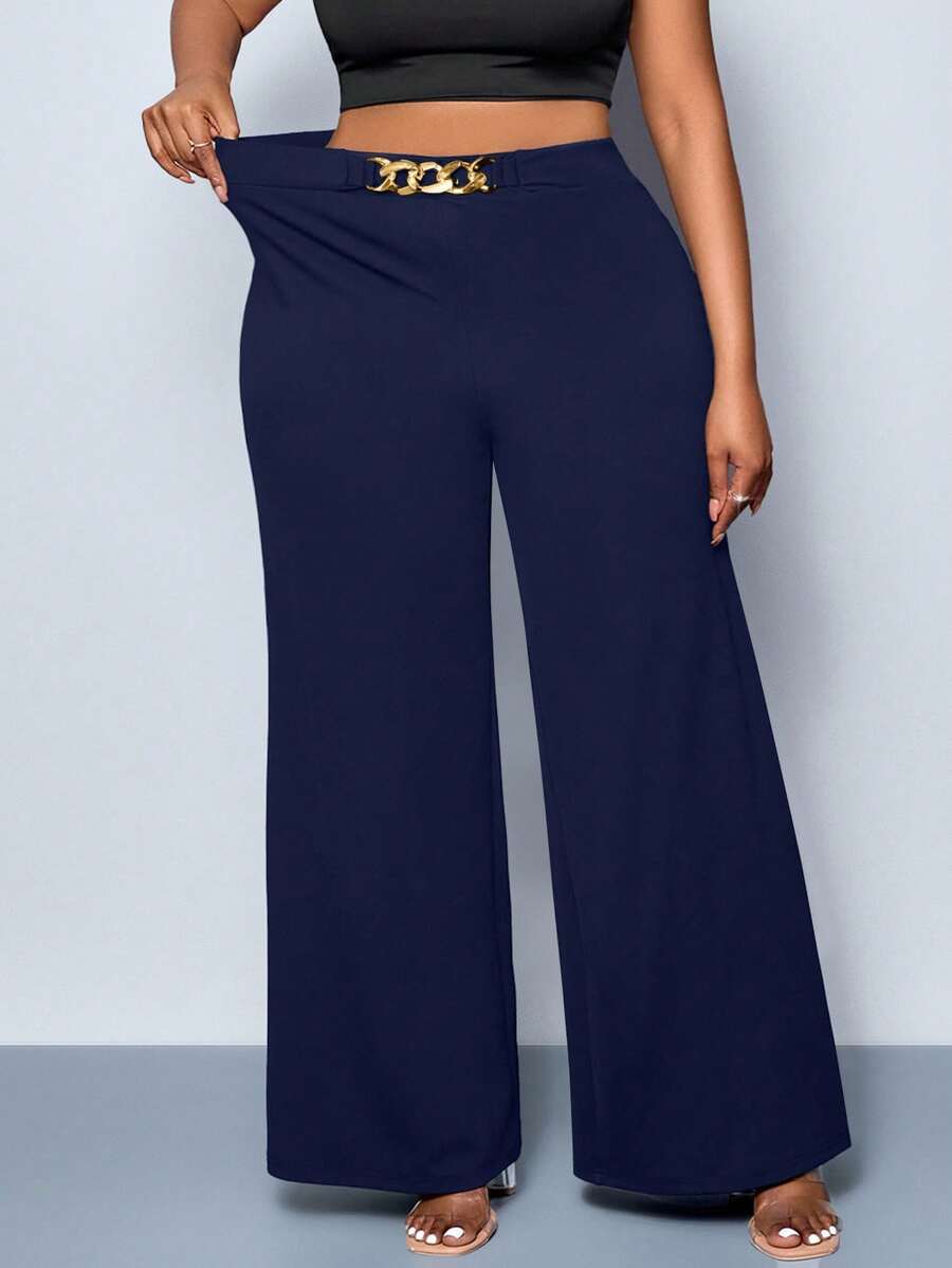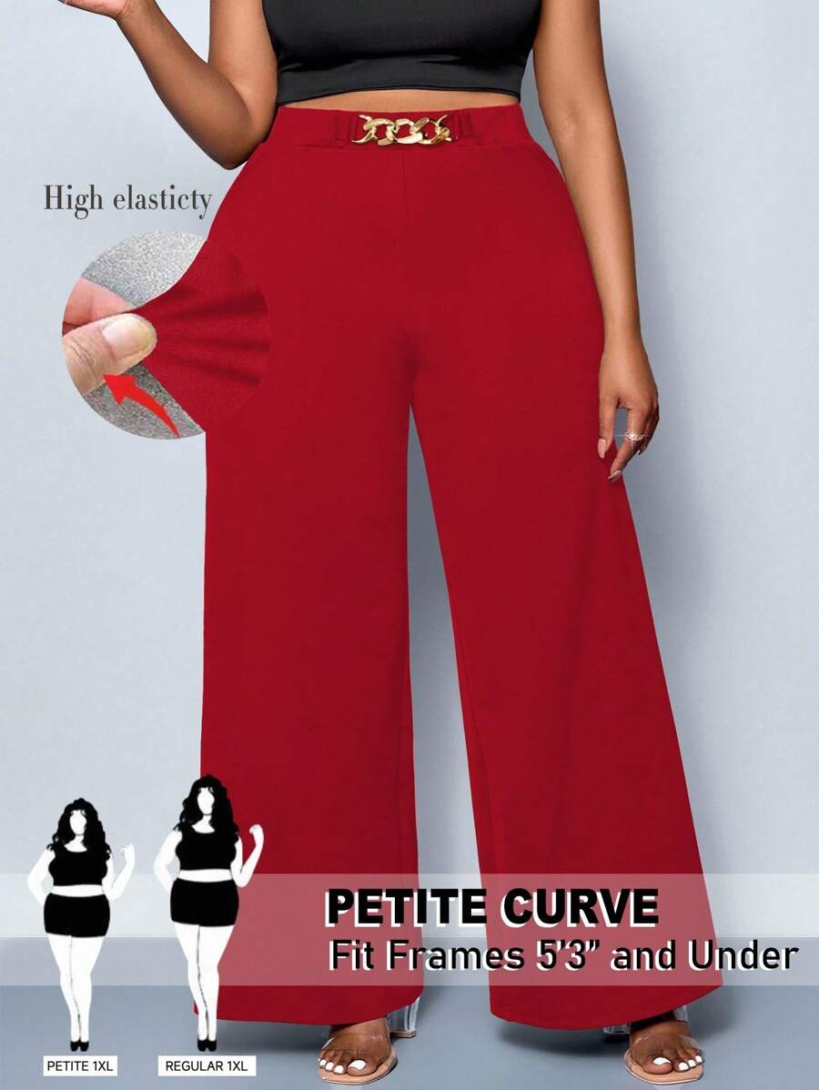 PETITE Plus Size Women's Solid Color Belt Metal Buckle Detail Wide Leg Pants, Tall Pants, Four Seasons Style, Party, Concert, Commuting Daily Style, Music Festival, Romance, Valentine's Day, Vacation, Spring And Summer Loose Pants
