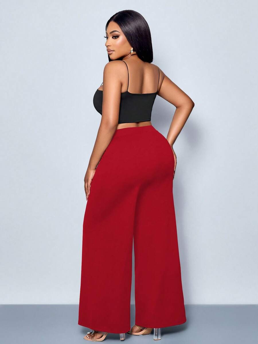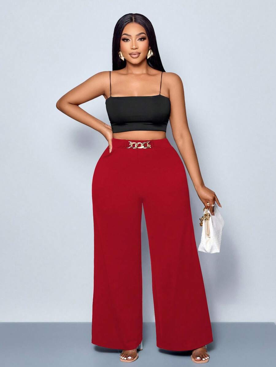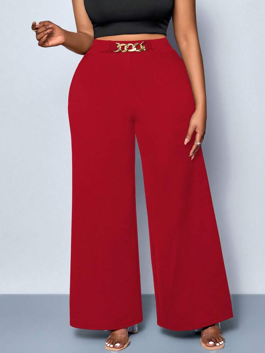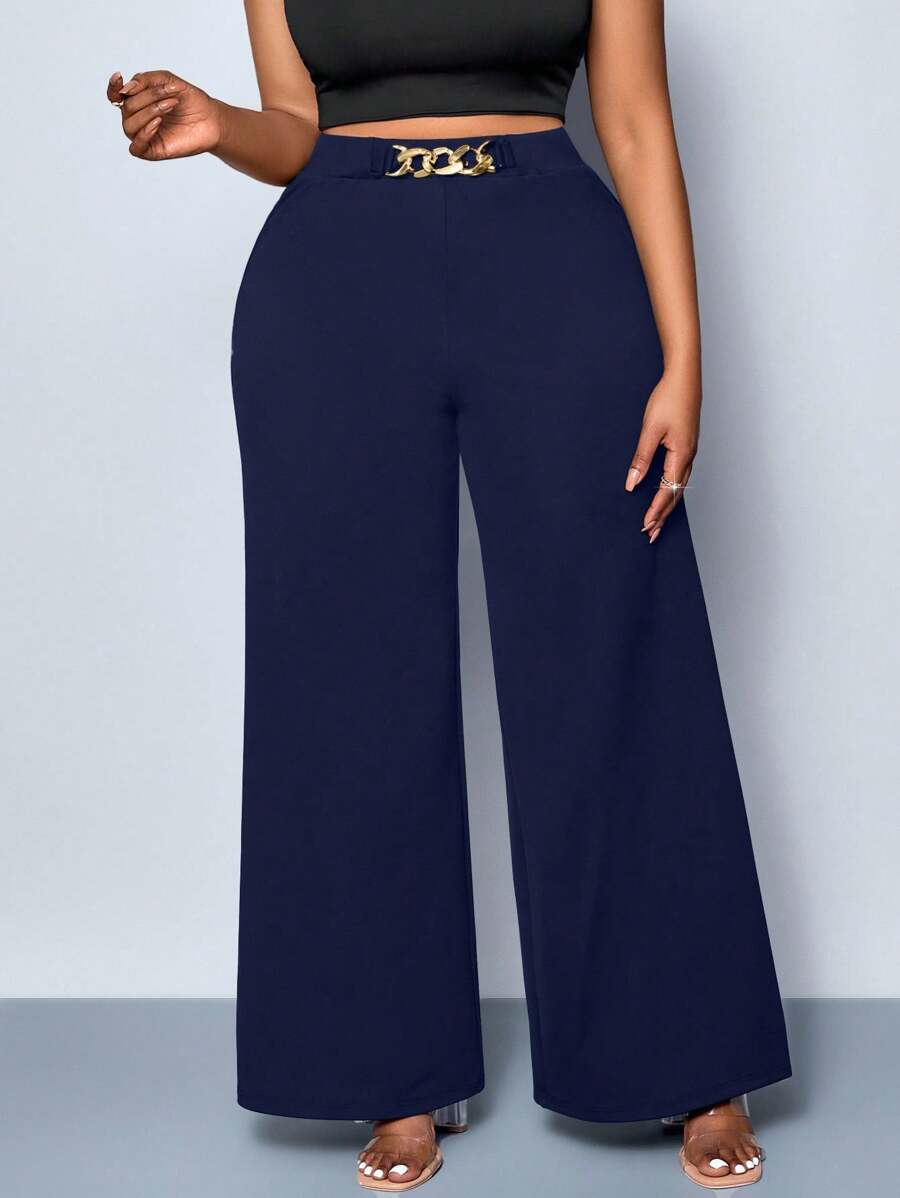 PETITE Plus Size Women's Solid Color Belt Metal Buckle Detail Wide Leg Pants, Tall Pants, Four Seasons Style, Party, Concert, Commuting Daily Style, Music Festival, Romance, Valentine's Day, Vacation, Spring And Summer Loose Pants