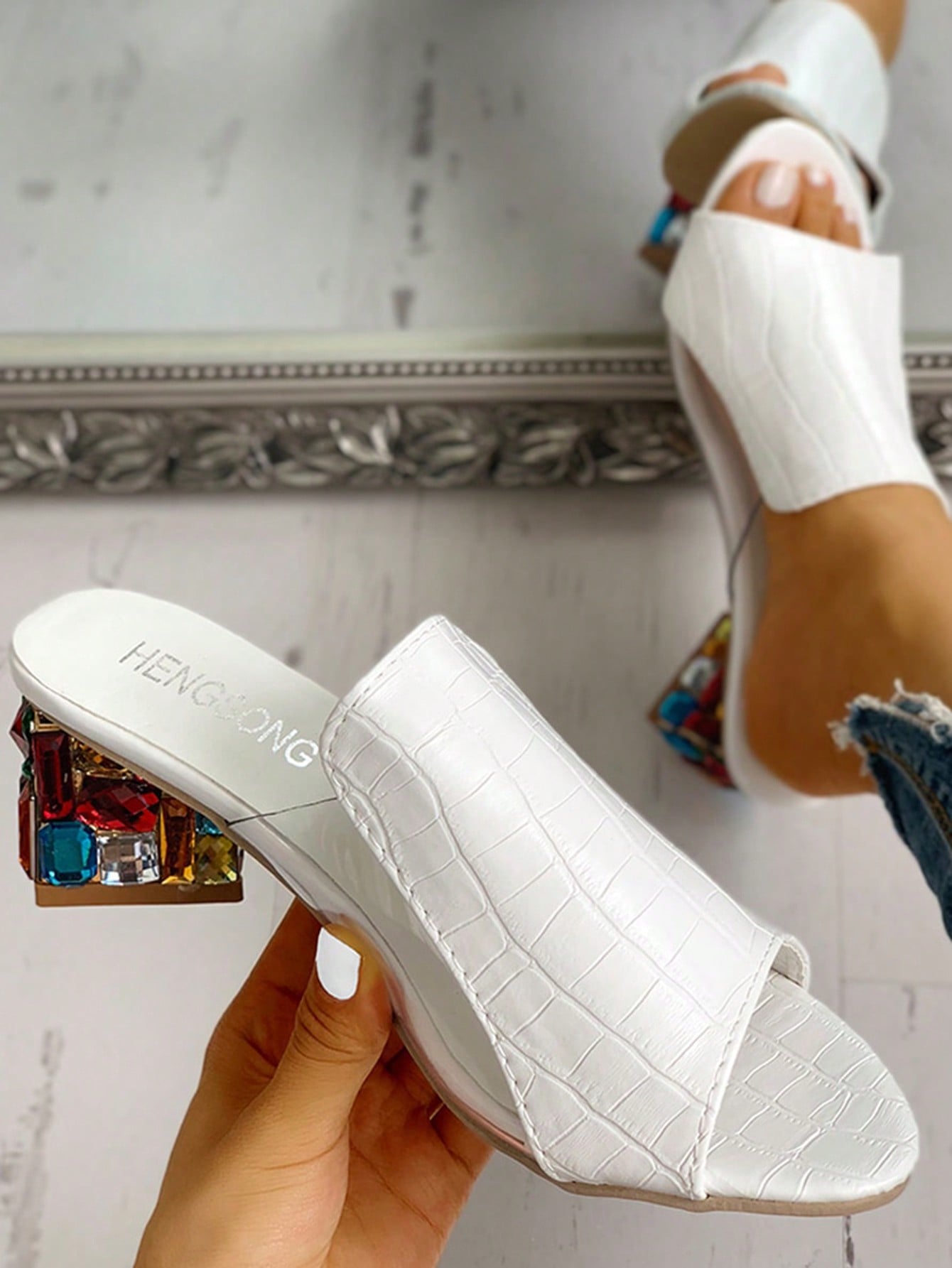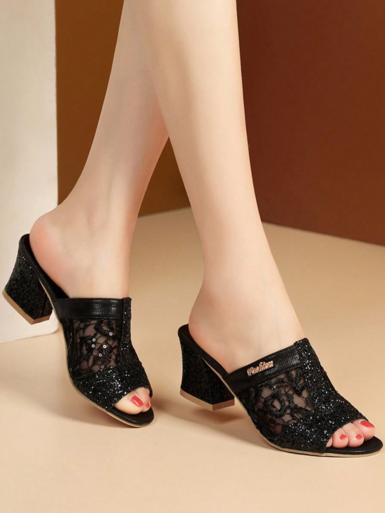 Women's Floral Patterned Open Toe Chunky Heel Slippers With Pvc Square Heel