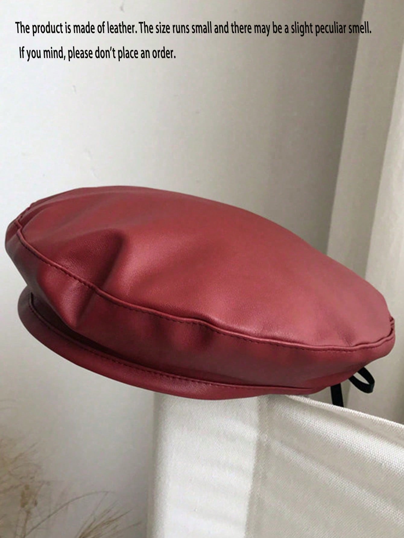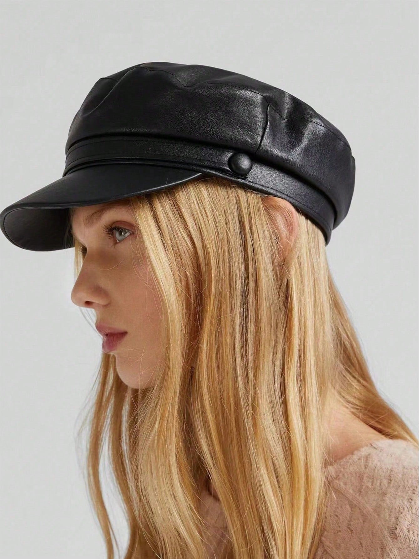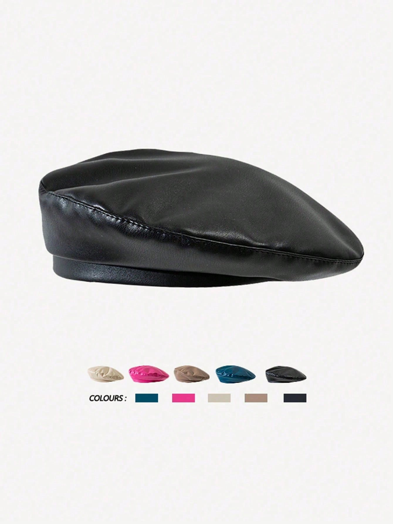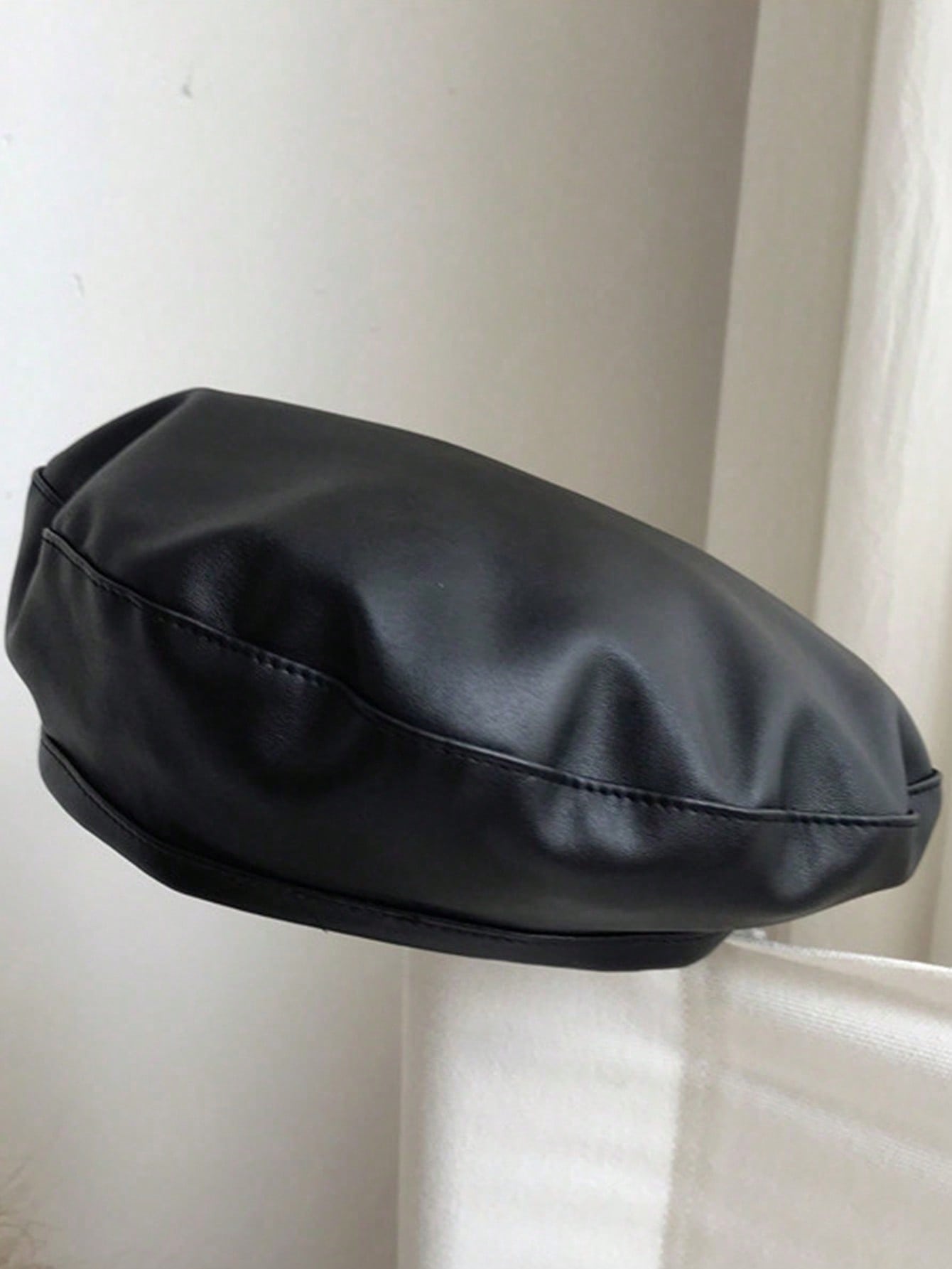 1pc Women's Black Flat Beret Hat, Versatile PU Painter Beret Cap, Pumpkin Shaped, Autumn/Winter
