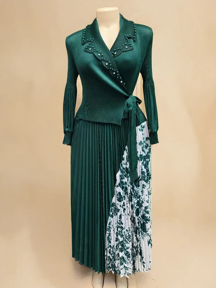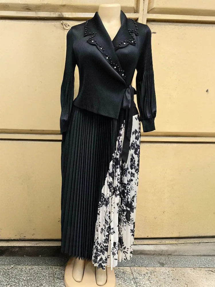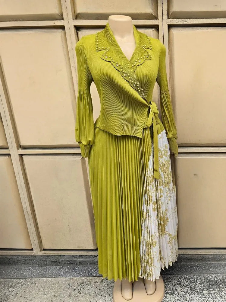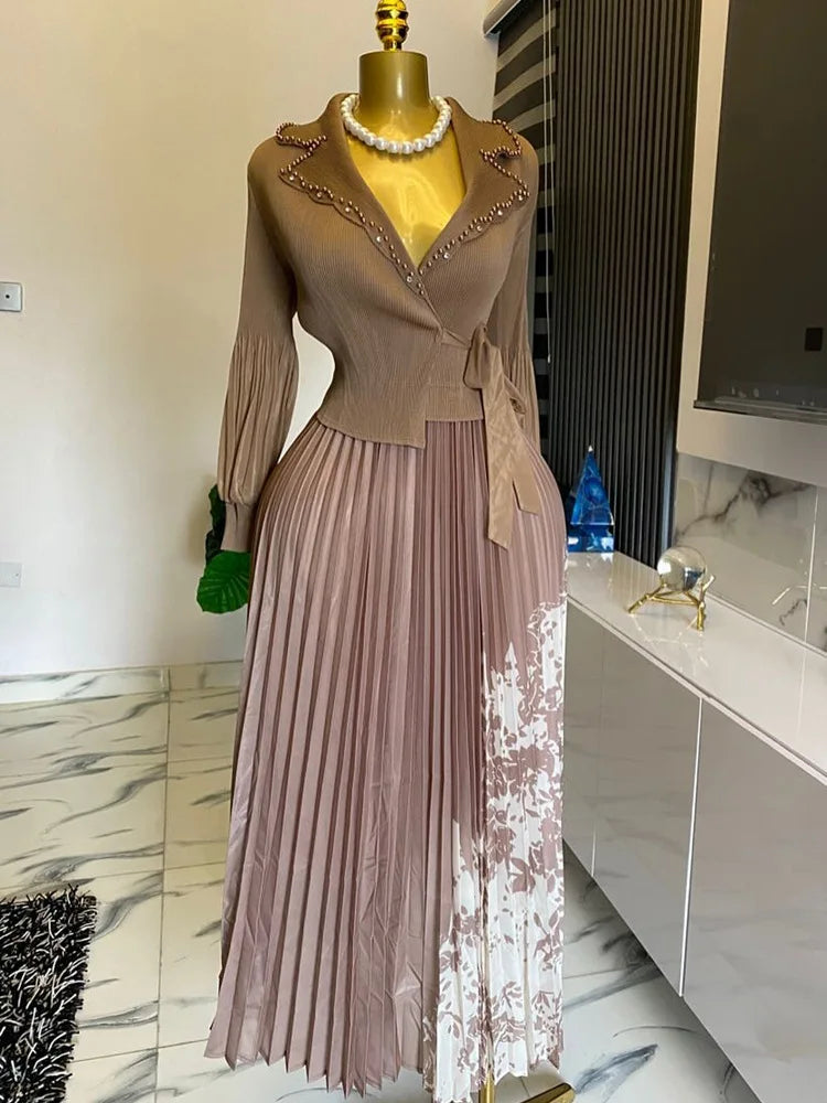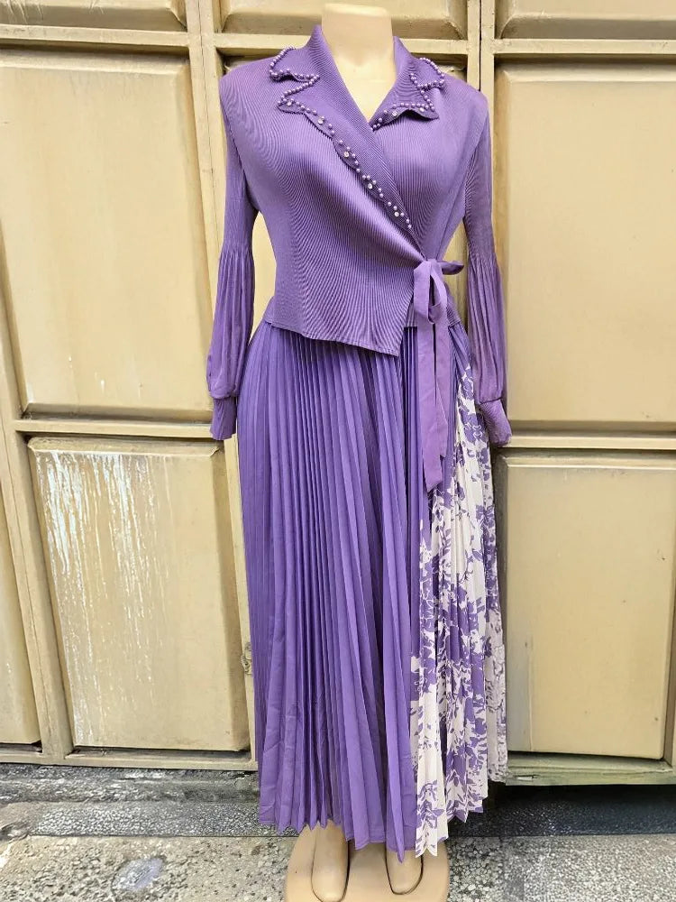 2025 Miyake Foreign Trade Wholesale New Print Nail Bead Lapel Bubble Sleeve Lace-up Temperament Large Size Women's Dress